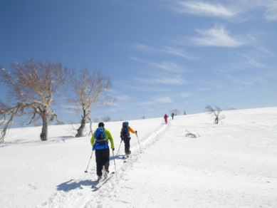 尾根上にでたが、アップダウンでなんどもスキーはいたりかついだり。ヘトヘト。