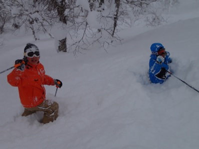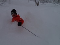 安全なところくだって、リフト裏から東側のサイドカントリーの林間ぬけて温泉までおりますた。