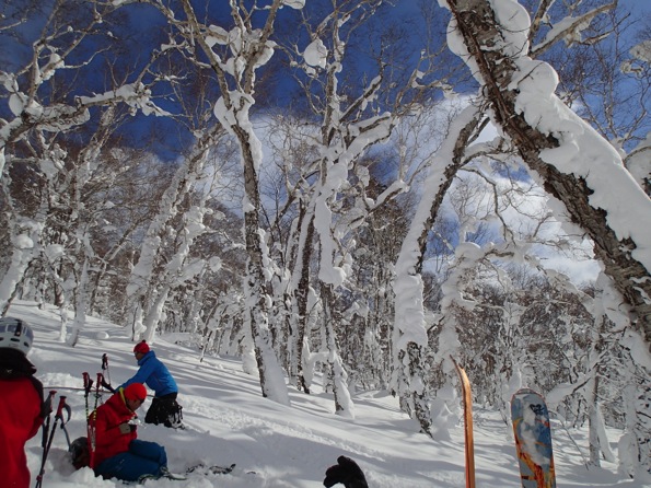 登ってきた斜面をくだり、樹林帯にはいると、それはそれは素晴らしいdeep powder。喜びのあまり二人叫びながら滑りました。